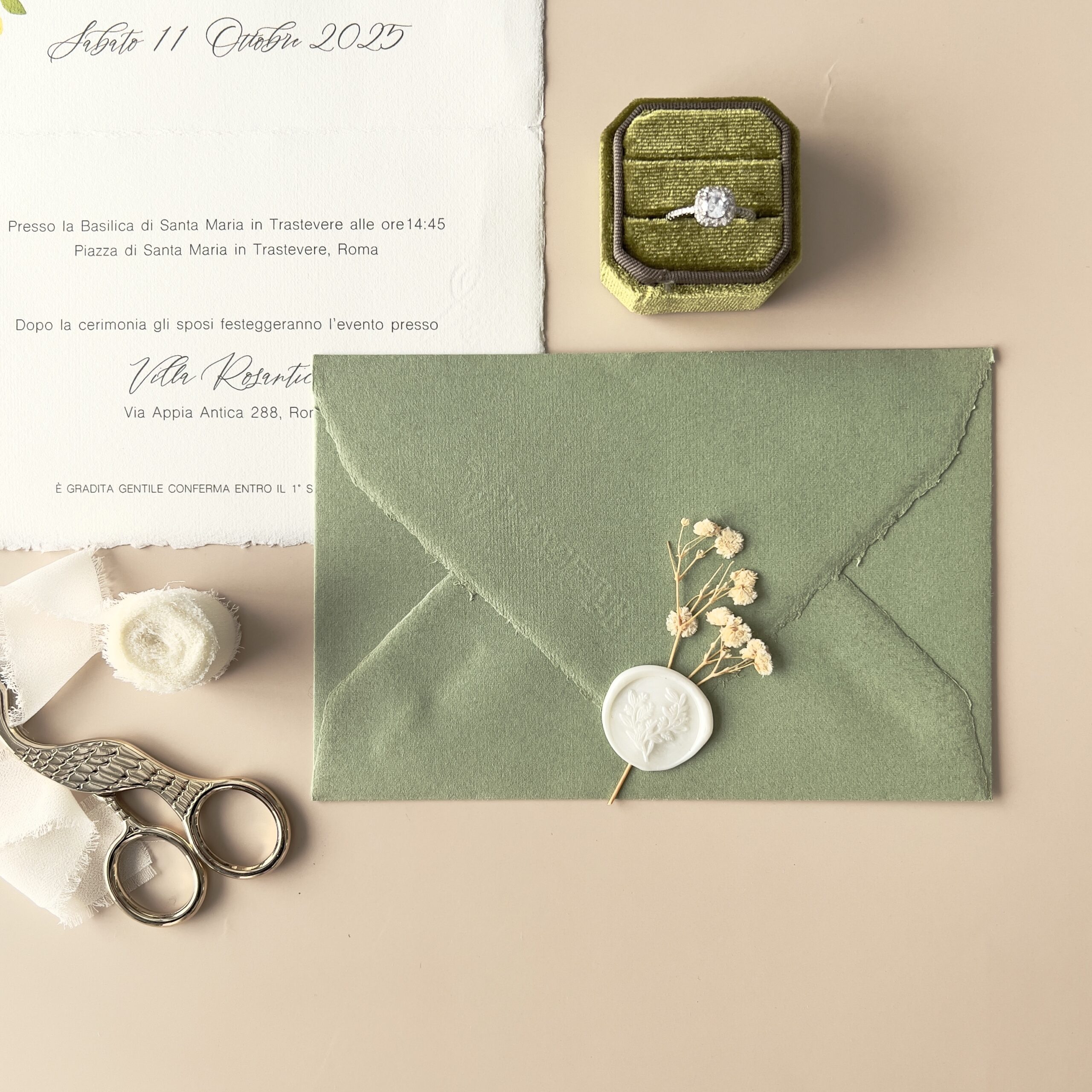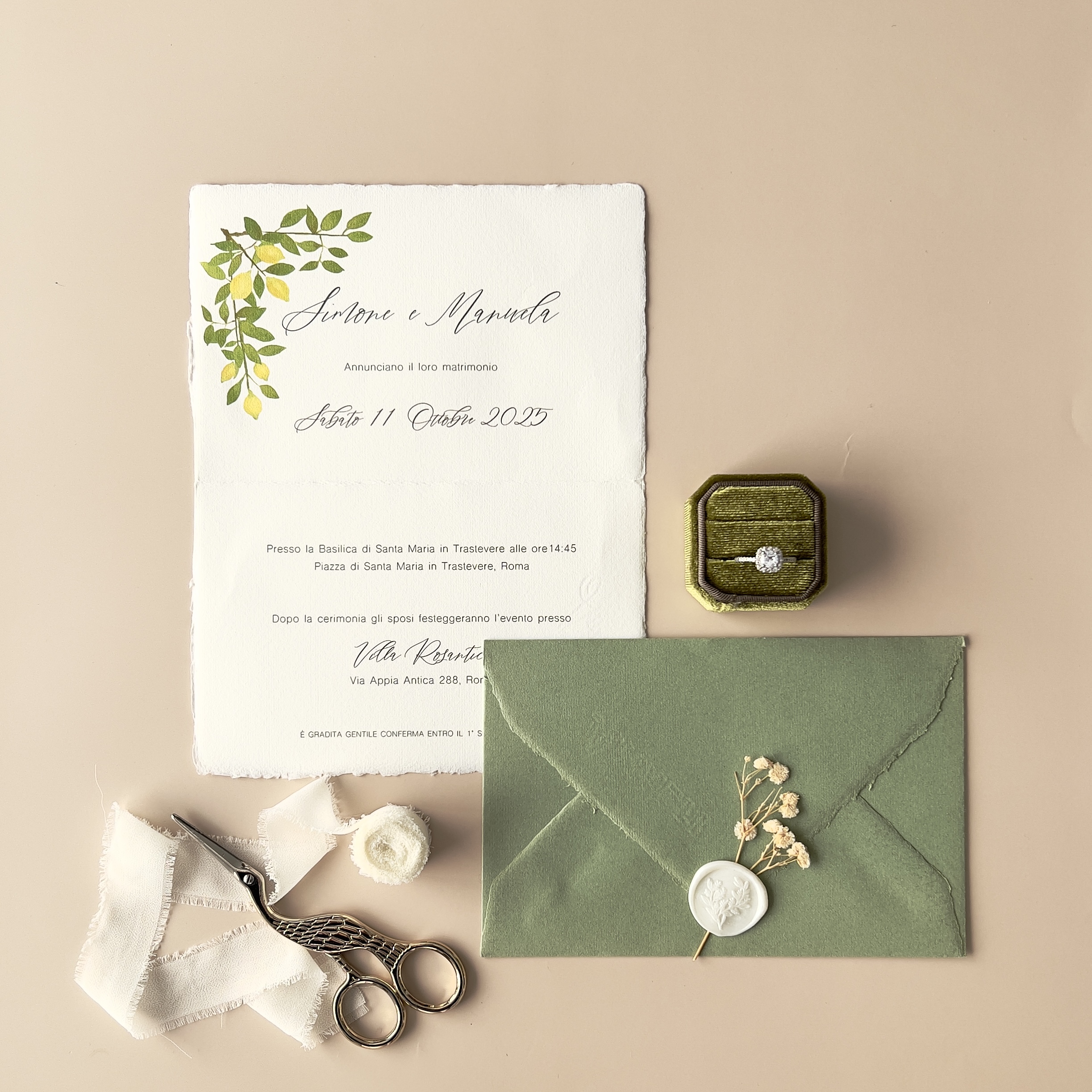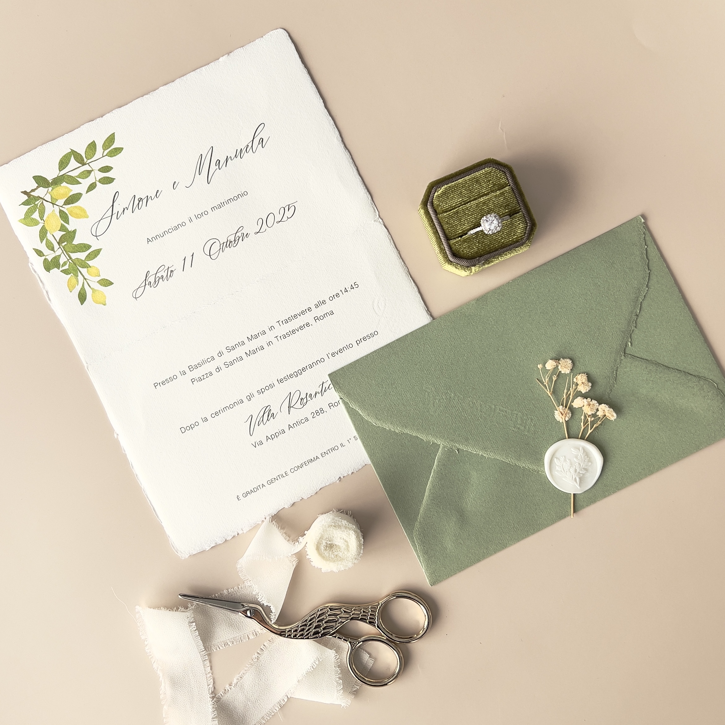 Il set è completato da una ricercata busta color verde, che crea un contrasto cromatico profondo ed elegante con la carta di cotone sfrangiata. Ogni invito è un pezzo unico, perfetto per chi sogna un matrimonio Destination Wedding o un evento in stile Amalfi coast.